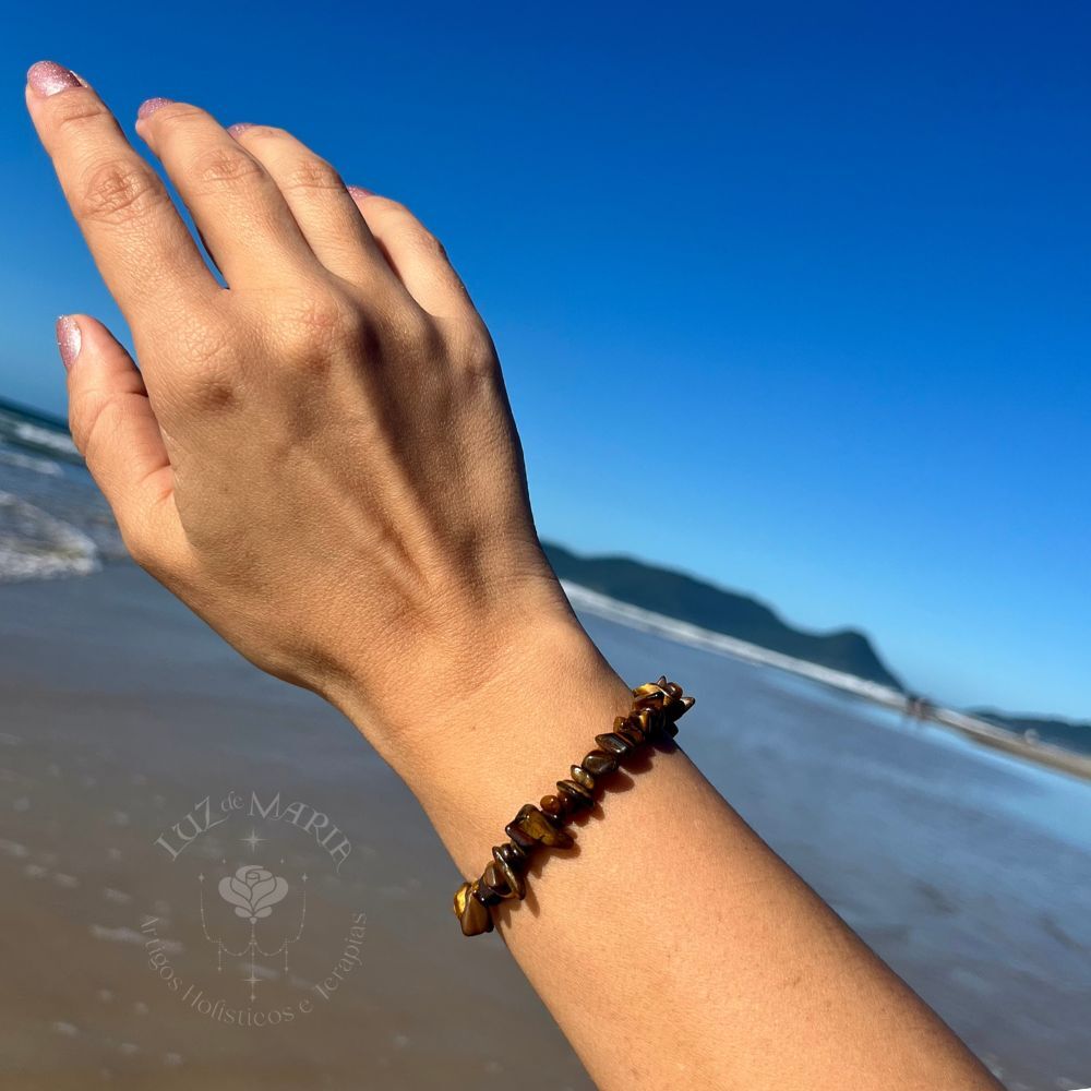 O que vem na embalagem: 01 pulseira de cascalho na pedra Olho de Tigre.